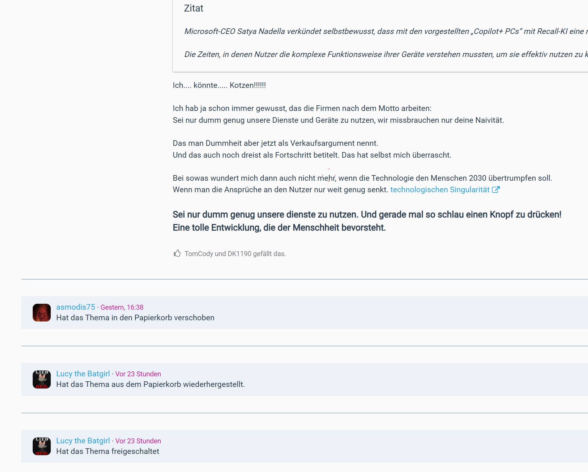 Findest du? Eigentlich recht eindeutig, Asmodis war dieser Post dann doch zu blöd und er hat ihn gelöscht (was auch richtig ist), Lucy hat den Papierkorb durchgewühlt, ihn gefunden, passte genau in ihr Raster und ist ideal um das Niveau-Limbo wieder ein Stück tiefer zu rücken. Also hat sie ihn wieder frei geschaltet.