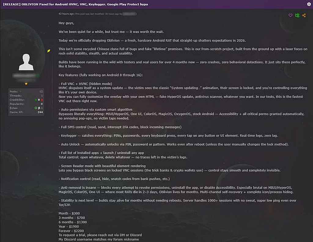Oblivion: Neuer Android-RAT ab 300 Dollar umgeht Sicherheitsabfragen bis Android 16 und kapert Smartphones per Hidden VNC.