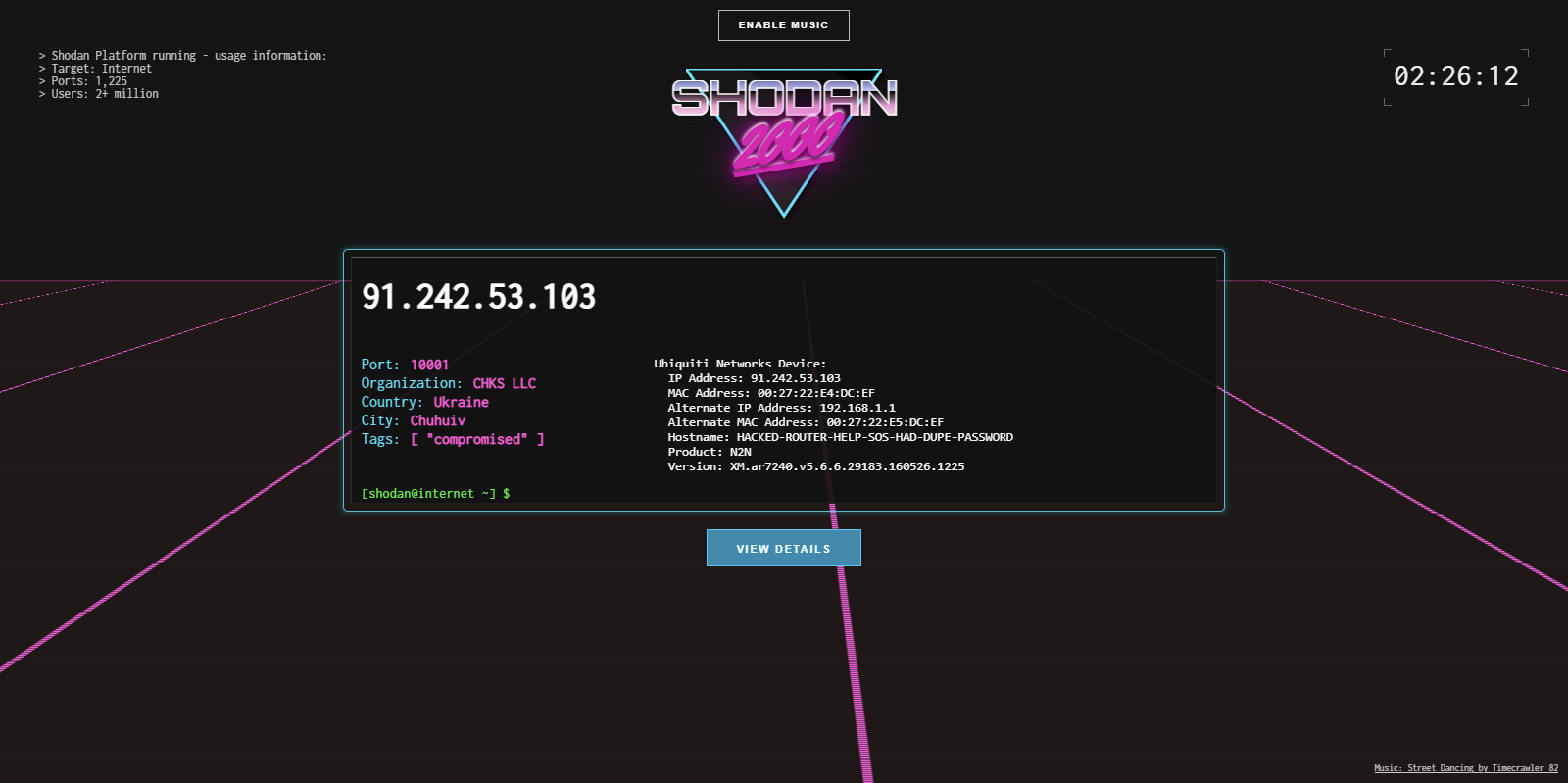 Shodan2000 zeigt mit passender 8-Bit-Musikunterlegung und animiertem 80er-Jahre-Hintergrund IP-Adressen und Details zu offenen Diensten im Internet.