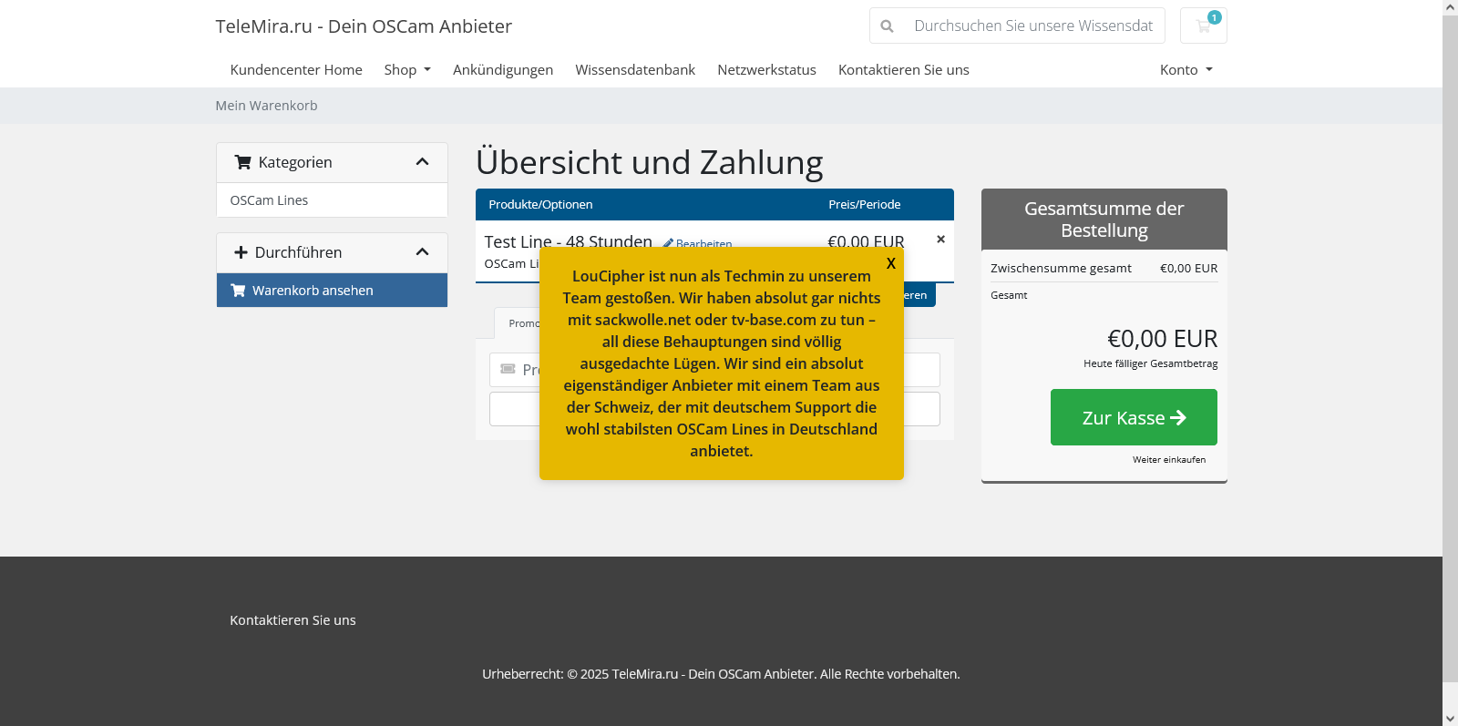 Bei einer Anfrage für eine Test-Line von (angeblich) @lou-cipher kommt bei der Weiterleitung zu telemira.ru genau das: