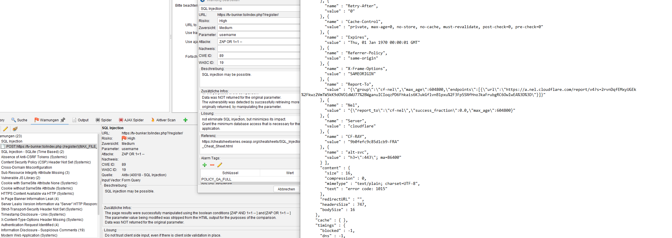 Werde berichten. Dein High Risk SQL ist die Response ein 429 mit Cloudflare error 1015. Damit ist dieser SQLi-Fund nicht valide als “DB-Lücke”.