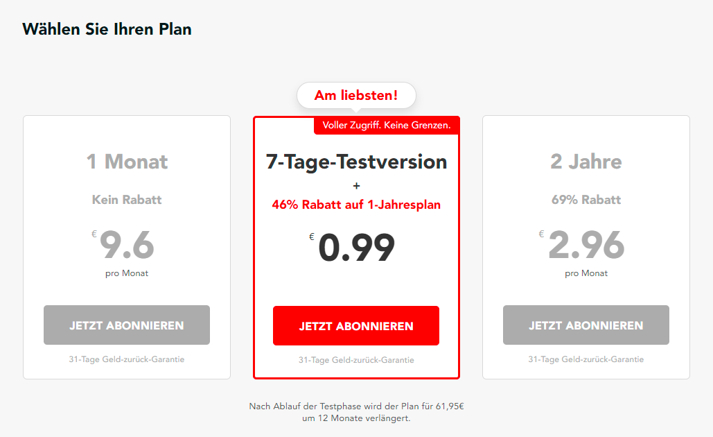 Option 1 sollte eigentlich automatisch enden nach sieben Tagen ! Option 2 verlängert sich automatisch nach den sieben Tagen in ein Jahres-Abo, mit dem ausgewiesenen Rabatt !! Trotzdem hast du natürlich die 31 Tage Geld zurück Garantie