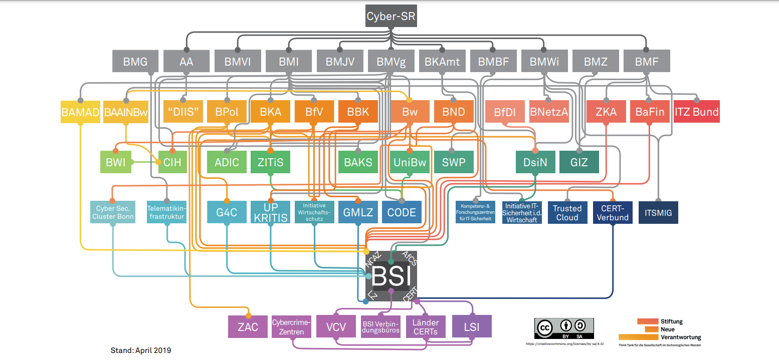 Dr. Sven Herpig und Tabea Breternitz von der Stiftung-Neue-Verantwortung, einem „ThinkTank für die Gesellschaft im technologischen Wandel“, veröffentlichten am 26.7.18 eine grafische Abbildung der staatlichen Cyber-Sicherheitsarchitektur, sowie ein Abkürzungs- und Akteursverzeichnis mit Erläuterung über Verbindungen einzelner Akteure. PDFs zur Grafik und Verzeichnis im Link