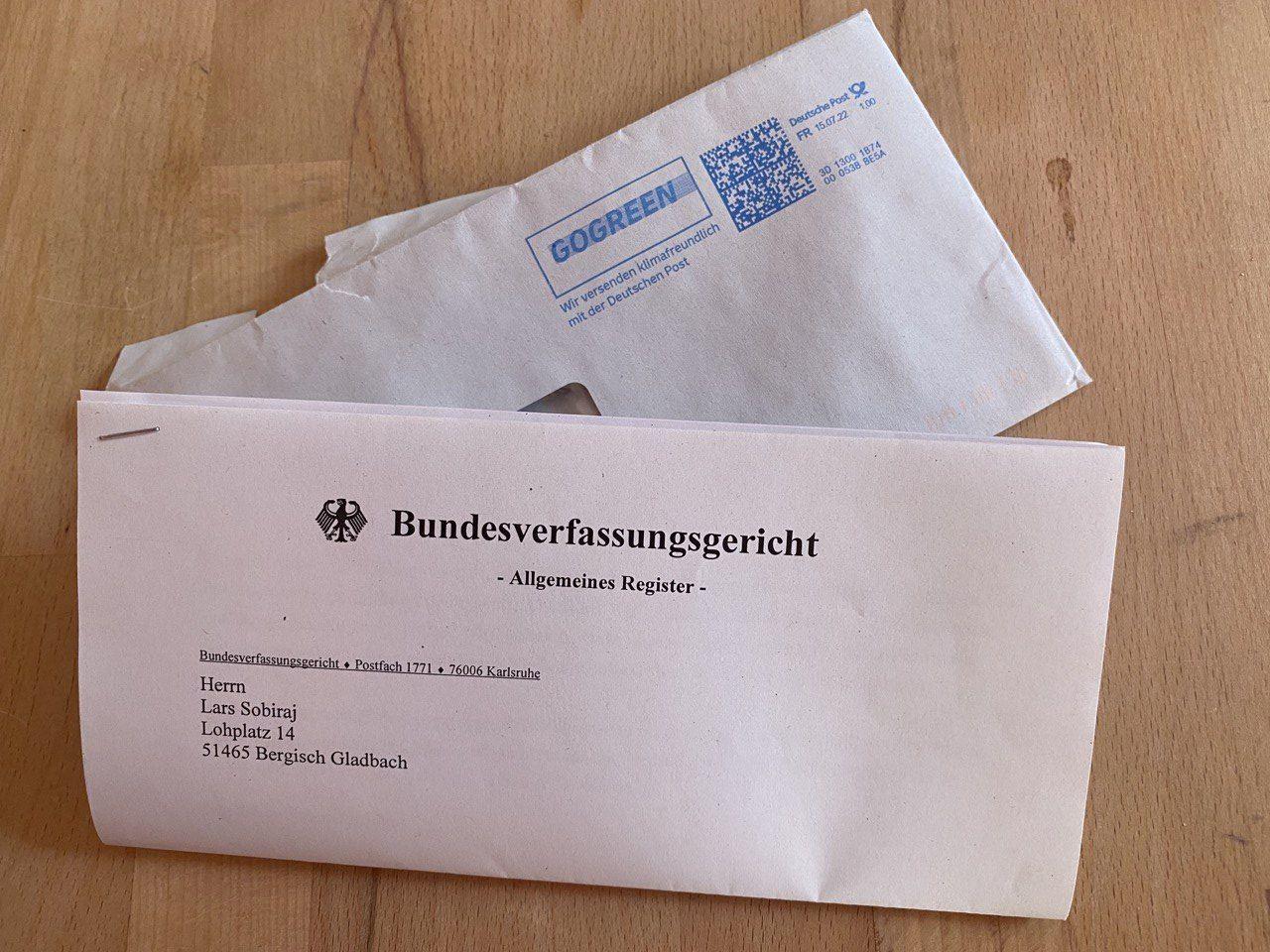 Wir bekamen gestern die Antwort auf „unsere“ Verfassungsbeschwerde vom 30. Juni beim Bundesverfassungsgericht. Mit dem Aktenzeichen AR 4128/22 teilt man uns mit, gegen die Zulässigkeit der Verfassungsbeschwerde würden Bedenken bestehen, weil es an einer ausreichenden Begründung mangelt. Dafür müsse man glaubhaft darlegen, inwiefern die Grundrechte verletzt wurden.