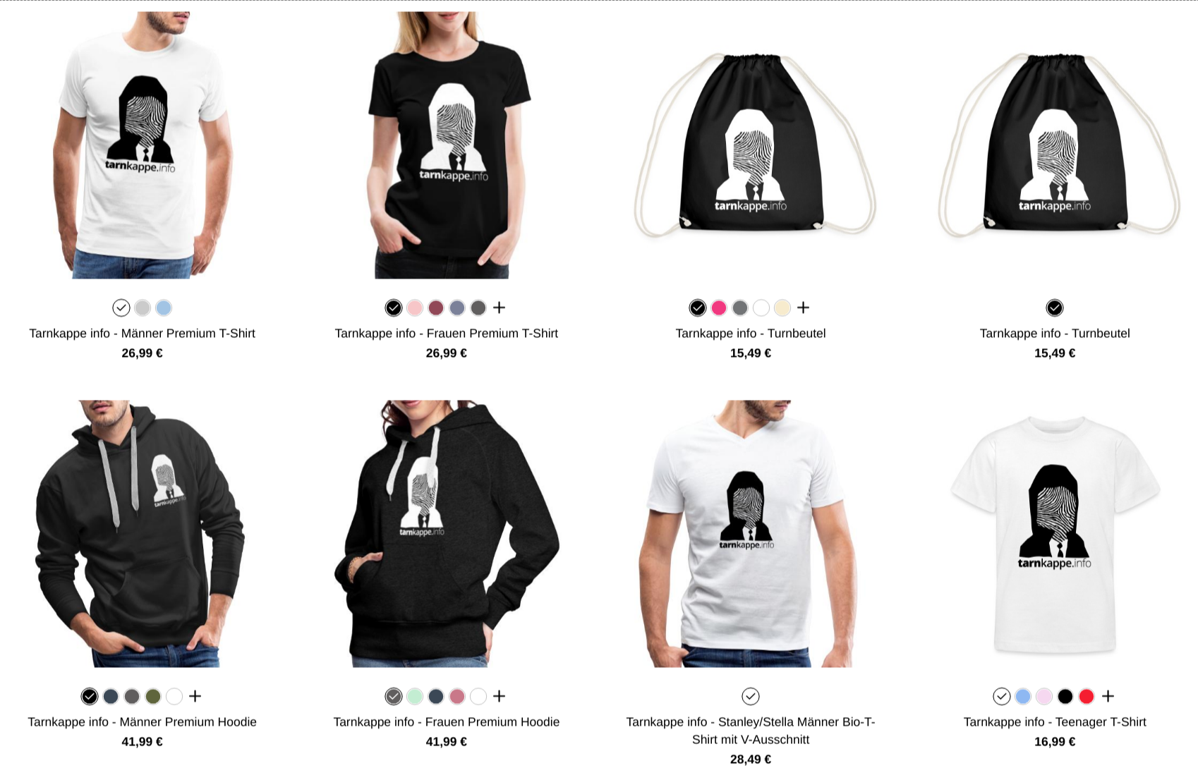Unsere Devotionalien kann bzw. muss man nicht raubkopieren. Im Tarnkappe Shop gibt es zum Beispiel Pullover, T-Shirts und andere Kleidungsstücke für Männer und Frauen in verschiedenen Farben. Außerdem gibt es Basecaps, Bio-Stoffbeutel, Buttons, die praktischen Mousepads, Camouflage-Aufkleber, Rucksäcke, Taschen, Kaffeetassen, Kühlschrankmagneten, Kissen, verschiedene Schutzhüllen für diverse Smartphones, Poloshirts, süße Teddybären, Trinkflaschen und vieles mehr.