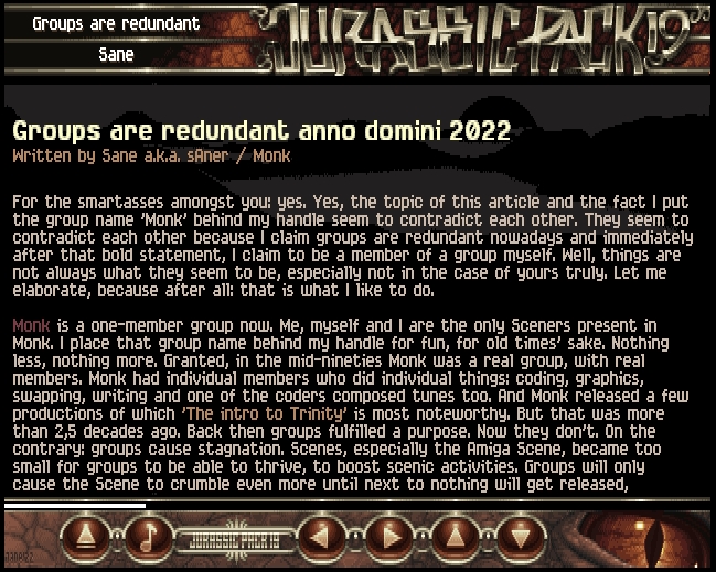 If we stick to groups, next to nothing will get released. If we forget about groups, the coder of group X, the musician of group Y and the graphician of group Z will be able to make an ace demo together. Just look at Jurassic pack #18 for example. Issue #18 of JP only saw the light of day because many Sceners from different groups participated together. There was not even a producing group behind JP #18.