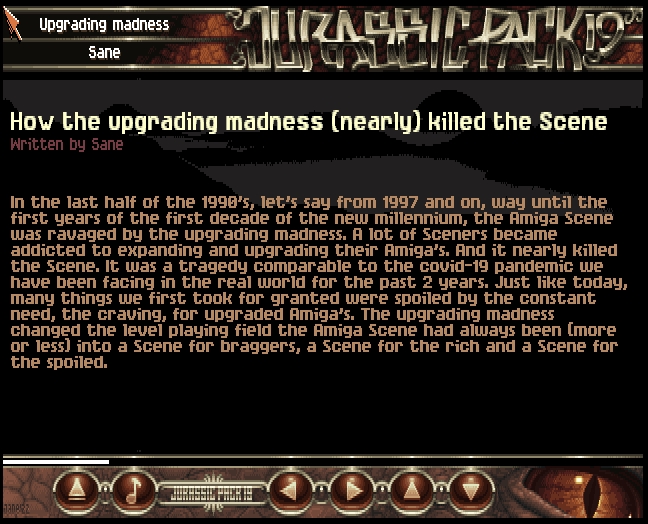 Yes, because who in the late nineties and early 2000s would have thought that decades later legends would have returned to the Amiga Scene? And who would have believed you would be reading the words you have just read in Jurassic Pack issue 19 (!), released in 2022? And who in their right mind would have guessed in the early 2000s the Amiga Scene would not only be alive two decades later, but had also returned to its roots?