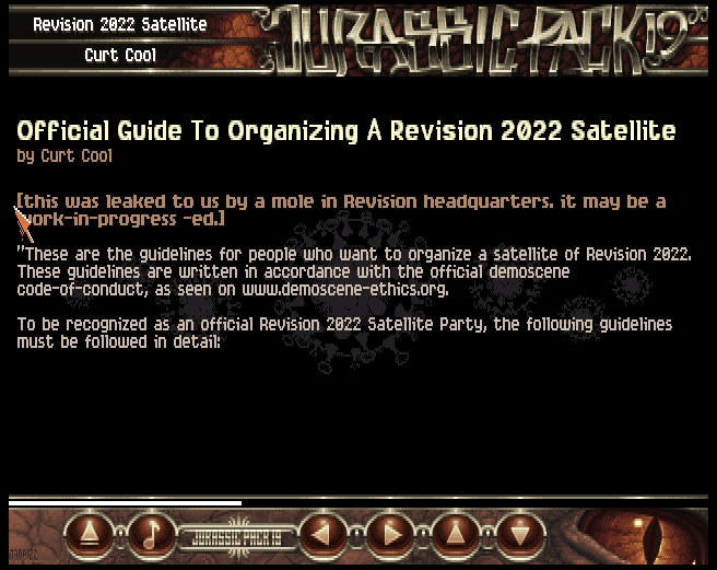 These are the guidelines for people who want to organize a satellite of Revision 2022. These guidelines are written in accordance with the official demoscene code-of-conduct, as seen on www.demoscene-ethics.org.