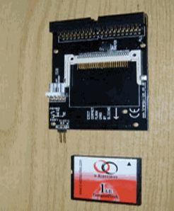 You can find them everywhere, well, in eBay mainly. The CF (Compact Flash) to IDE adaptors. As far I know the interface is very simple because CF system is based on the IDE interface. The adaptor can be found easily for less than 5 euros. Search „cf ide“ on ebay to find some of them. But, why use CF instead of a hardrive?