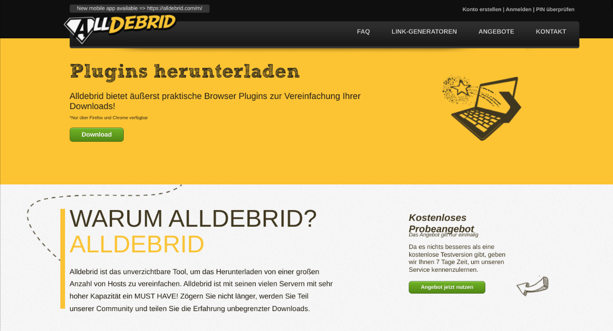 Die Zukunft gehört schlauen Konzepten, die nicht totzukriegen sind. Weil niemand vor ihnen rumturnt. Und weil Konzepte etwas Geistiges sind und jederzeit ausschwärmen können. Solch ein Konzept ist Alldebrid.com. Die Betreiber sind wohl Franzosen – jedenfalls ist die Twitter-Seite von denen auf Französisch. Das Forum ist zusätzlich auf Englisch und Türkisch. Ist ja auch nebensächlich.