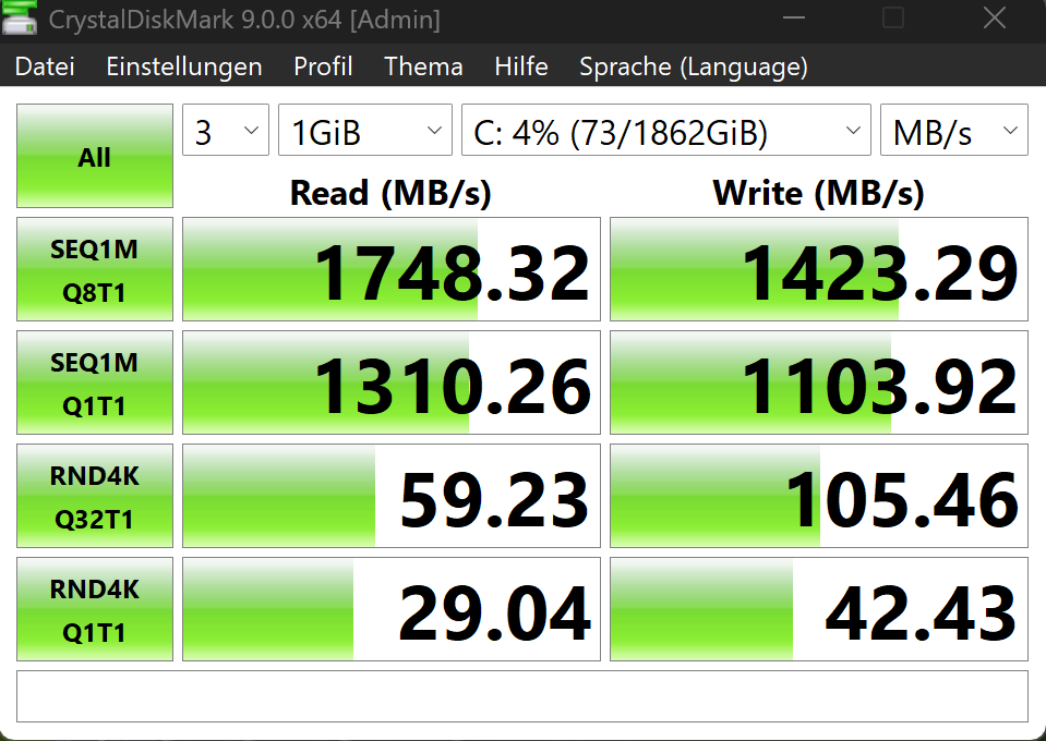 Die in meinem GEEKOM verbaute NVMe-SSD ist eine Crucial Gen 4 M.2280 mit 2 TB. Wie ihr es erwartet, habe ich euch natürlich auch die Daten von CrystalDiskMark hinzugefügt, damit ihr euch ein Bild von der Leistung machen könnt. Die leider fest verlöteten RAM-Chips stammen von Micron. Ich finde beides sehr angenehm und zeitgemäß, halt so, wie es sich gehört.