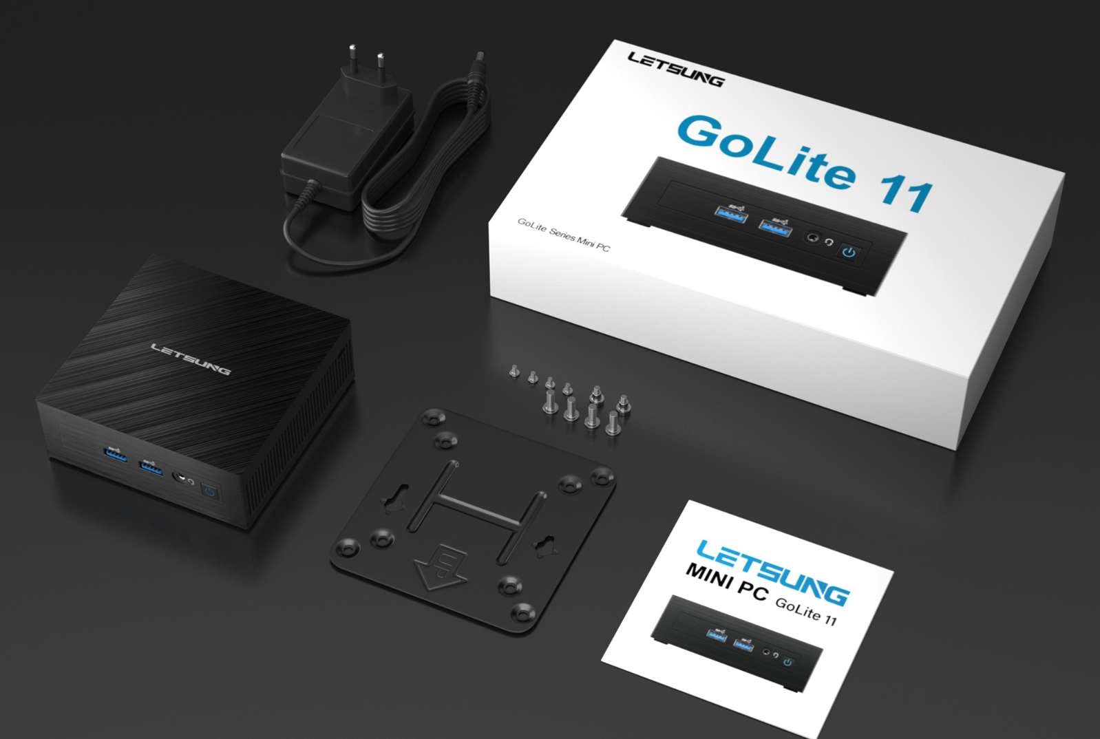 Der Mini-PC von Letsung kommt in einer Schachtel, die kaum größer als ein Taschenbuch ist. Enthalten sind das Gerät selbst, ein 24-W-Netzteil, eine VESA-Halterung, ein HDMI-Kabel und eine Kurzanleitung. Das Gehäuse misst 115 × 112,5 × 41 mm, wiegt laut Hersteller gerade mal 274 g (mit Netzteil ~700 g) und passt somit wirklich in die Handfläche.