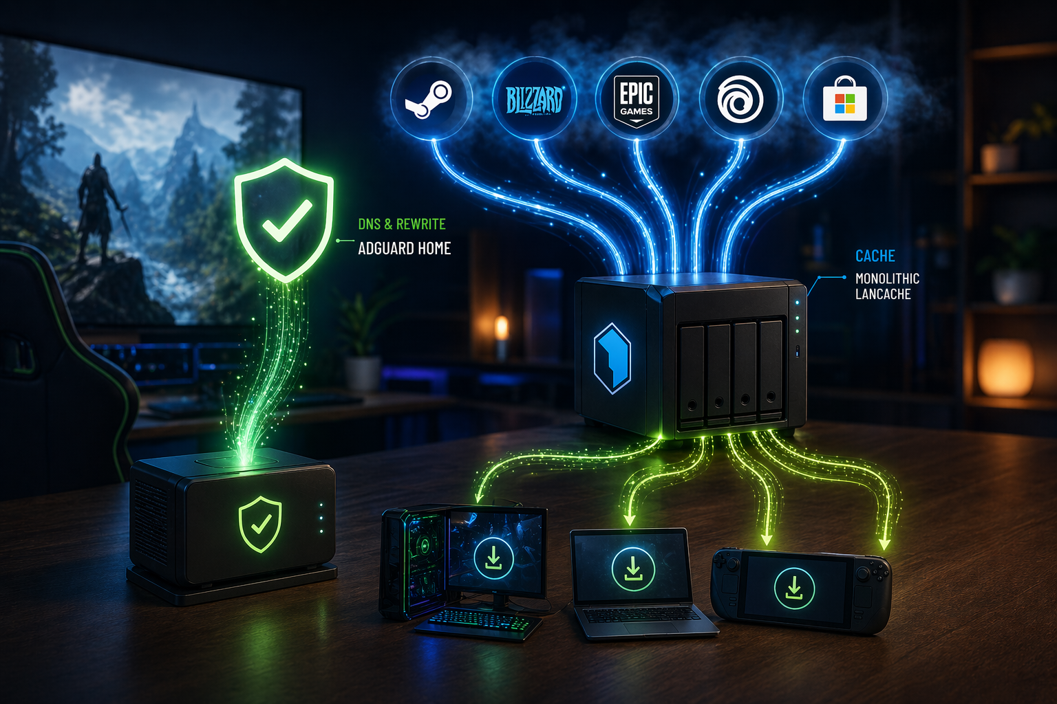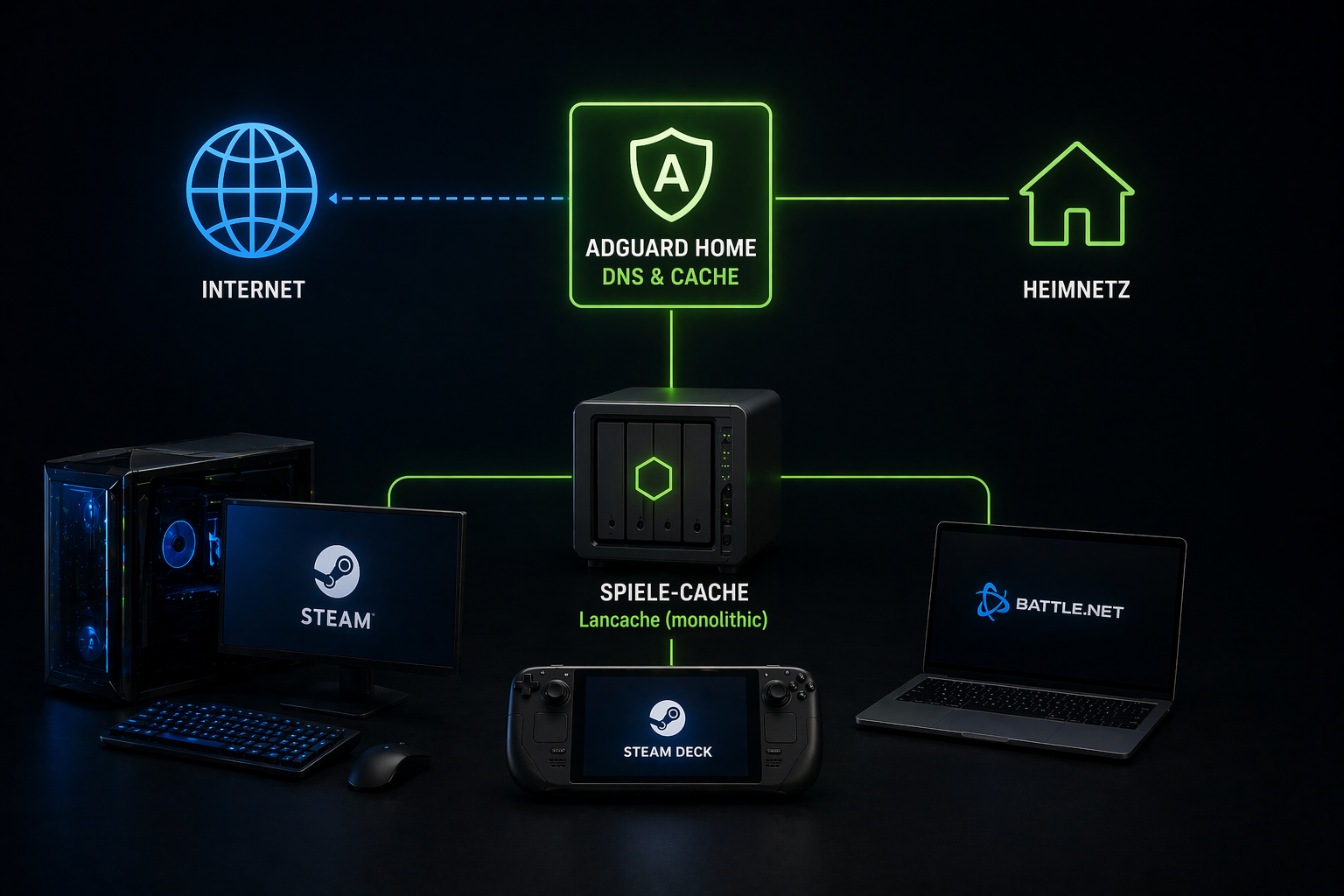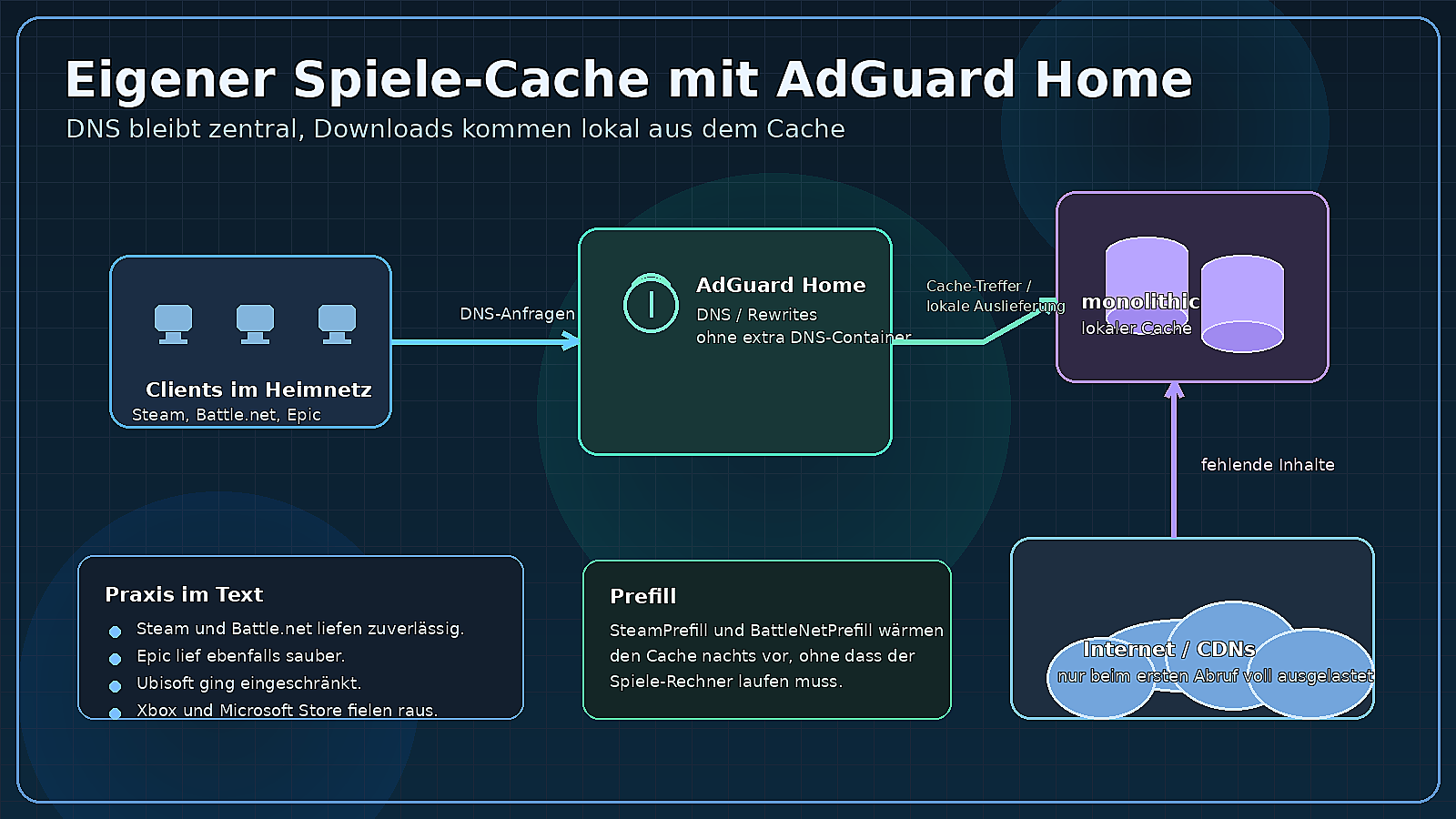 Große Updates über Battle.net, etwa für World of Warcraft oder Call of Duty, muss man nicht jedes Mal wieder vollständig herunterladen. Das gilt ebenso für Spiele bei Steam. Wer AdGuard Home im Heimnetz bereits als DNS nutzt, kann das technische Setup Lancache so aufsetzen, dass der zusätzliche DNS-Container entfällt. AdGuard Home übernimmt die Umschreibungen, während die All-in-One-Containerlösung monolithic die Downloads lokal vorhält. Steam und Battle.net laufen damit zuverlässig. Ubisoft funktioniert nur eingeschränkt. Epic ebenfalls. Xbox und der Microsoft Store fielen dagegen raus.